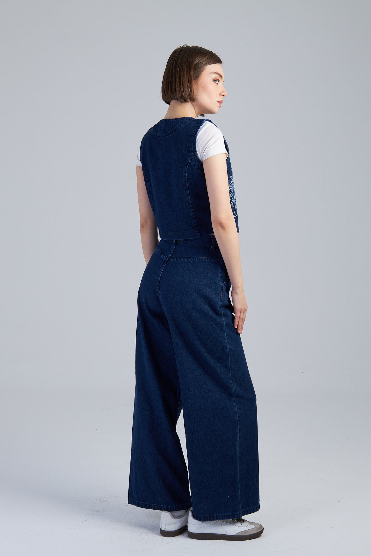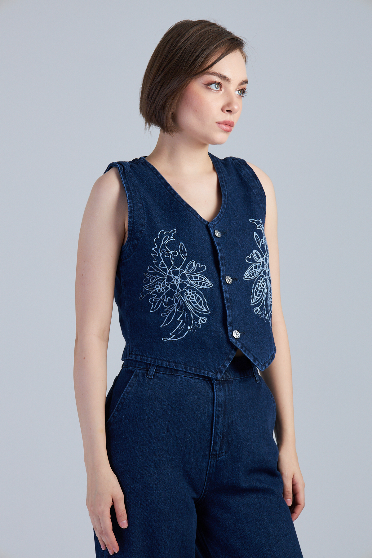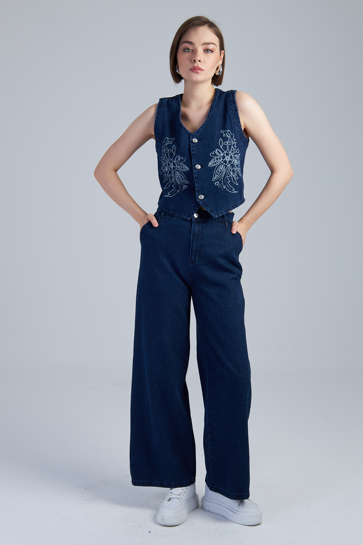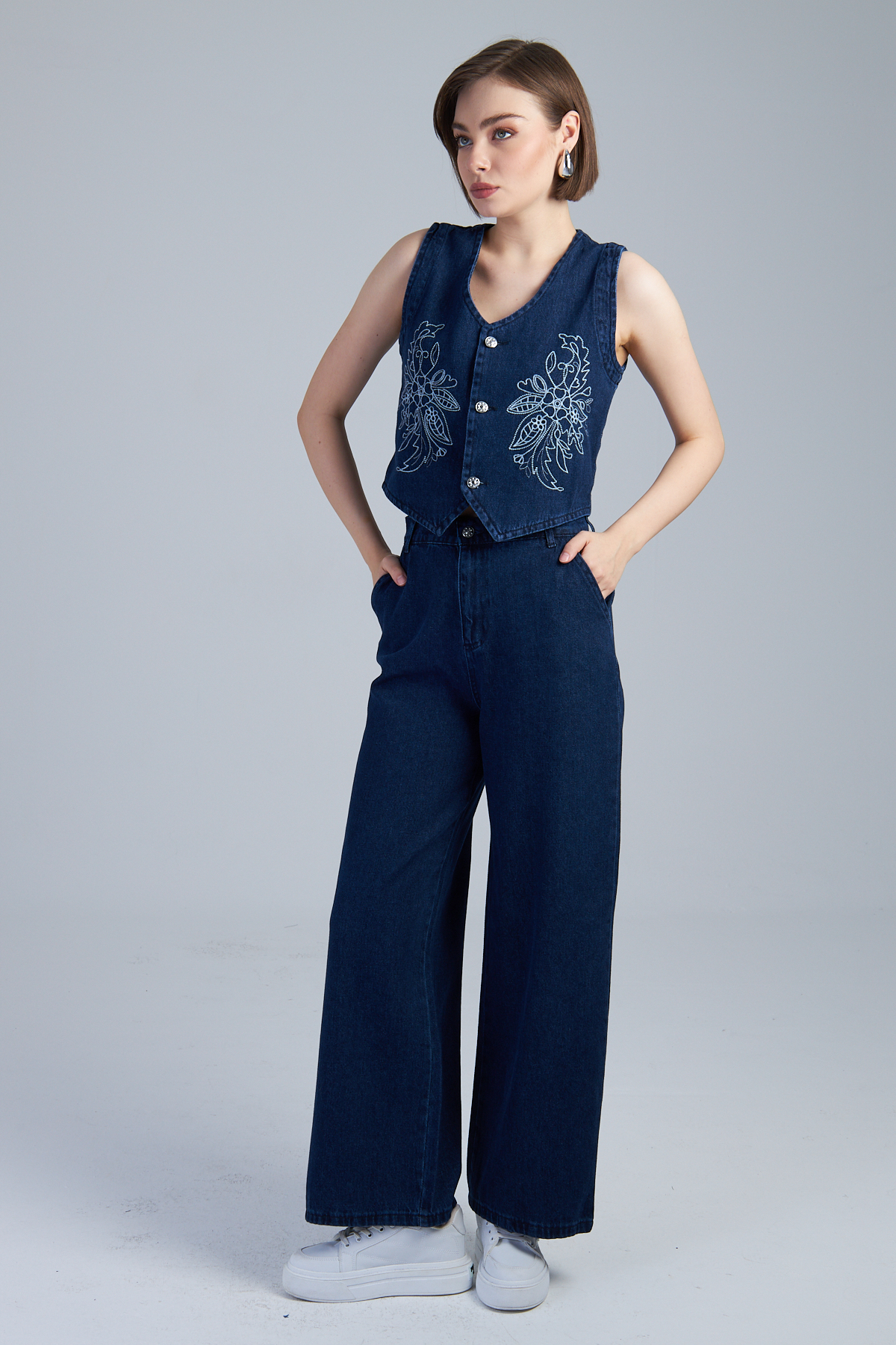 12 Noz Kot Kumaş Nakış Detaylı Yelekli İkili Takım – %100 pamuk 12 noz kot kumaştan üretilmiştir. Sıfır kol ve V yaka detayıyla modern bir görünüm sunar. 4 cepli tasarım ve yelekte nakış detayıyla şıklığı tamamlar. Denim dokuma tekniği ile üretilmiştir. Geniş kalıptır.