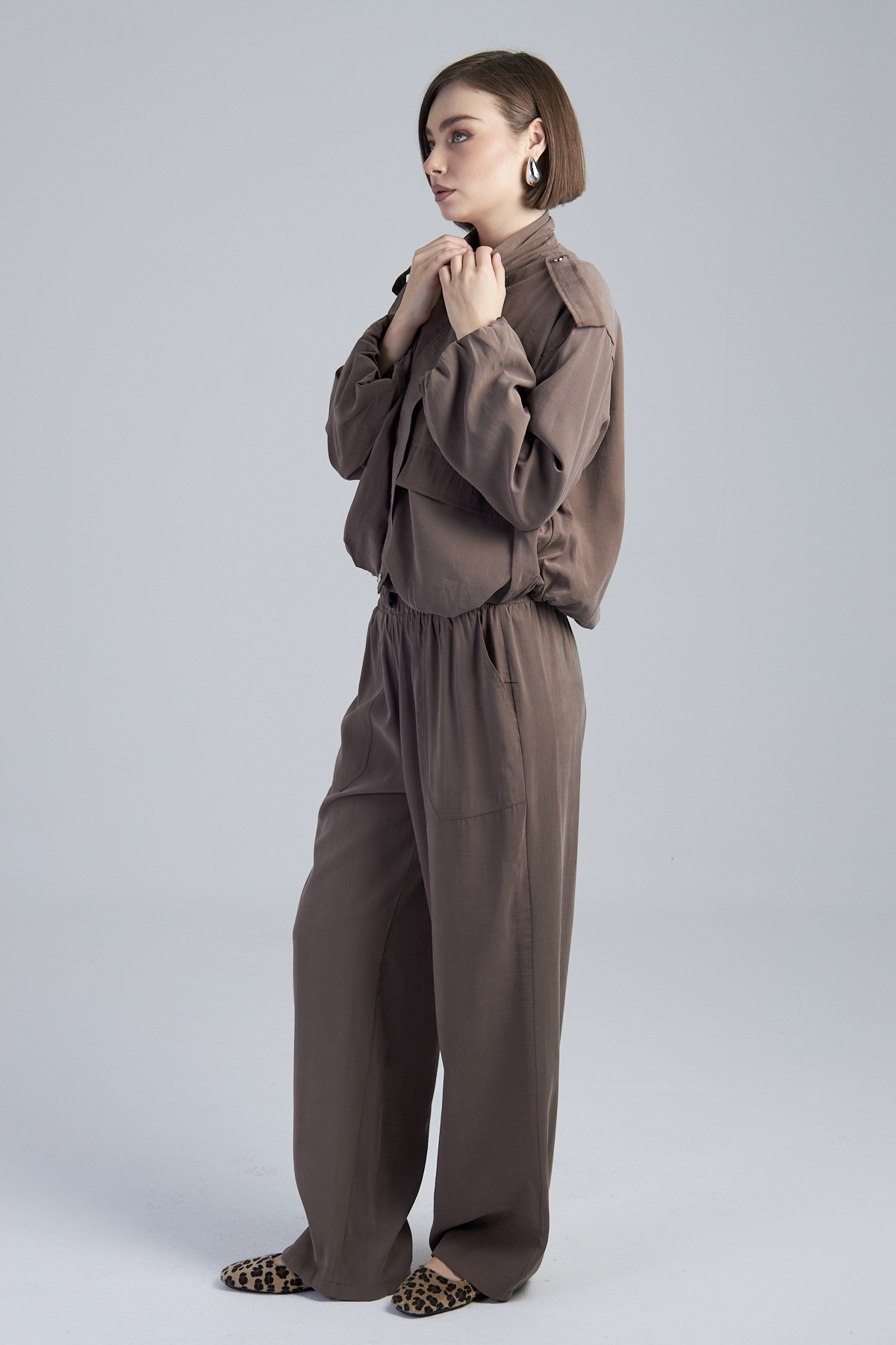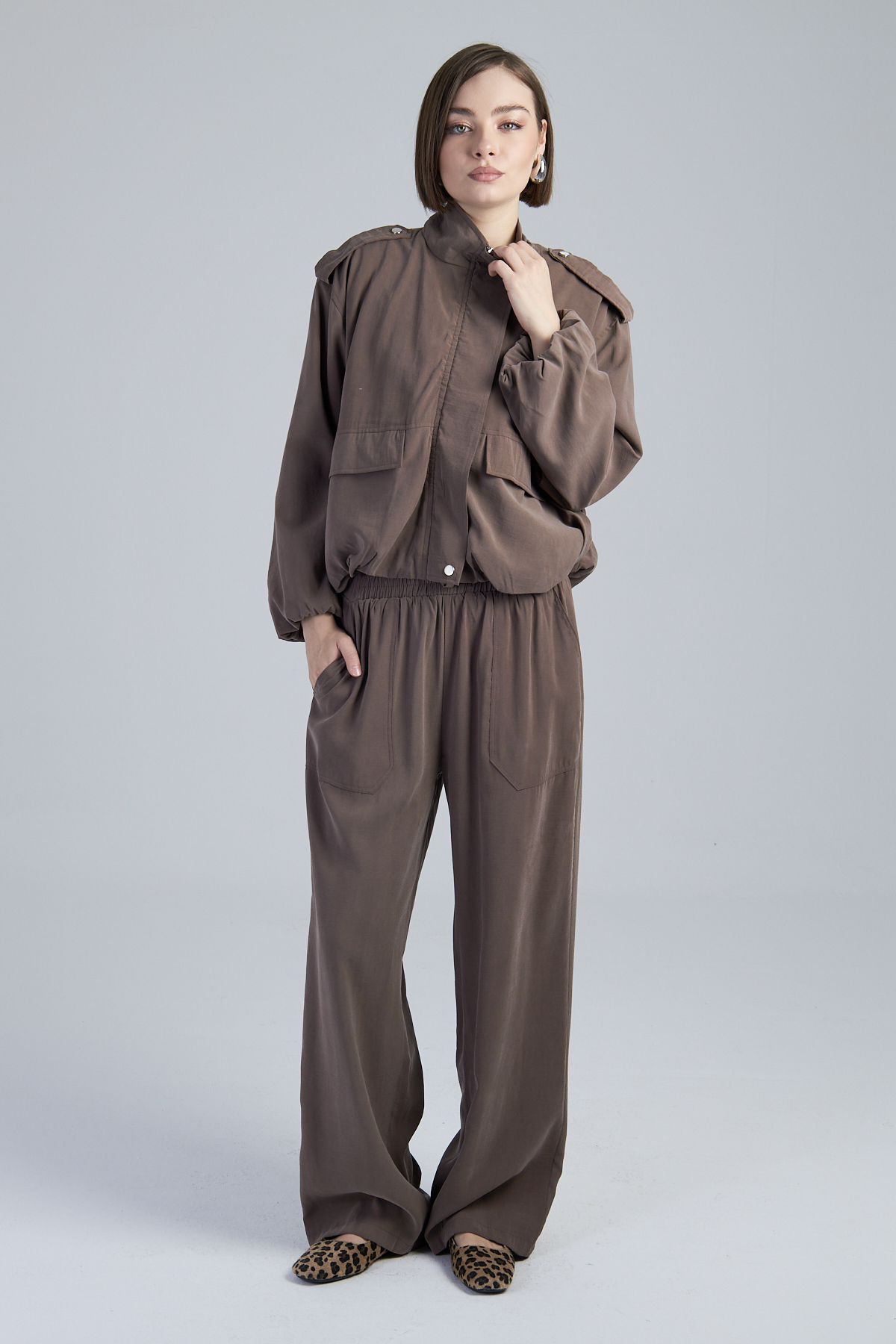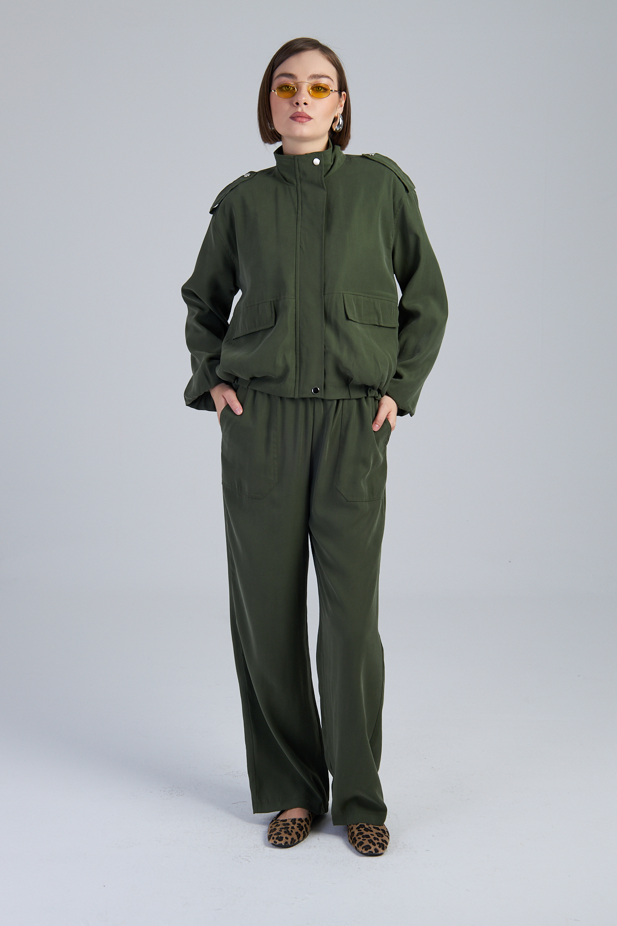 Camelya Tensel Kumaş Kargo Cepli İkili Takım – %90 viskon %10 polyester camelya tensel kumaştan üretilmiştir. Takma oversize kol ve dik yaka detayıyla modern bir görünüm sunar. Cekette 2 adet kargo cebi, pantolonda 2 adet cepli tasarım ve ceketten bambır detayıyla şıklığı tamamlar. Oversize kalıptır.