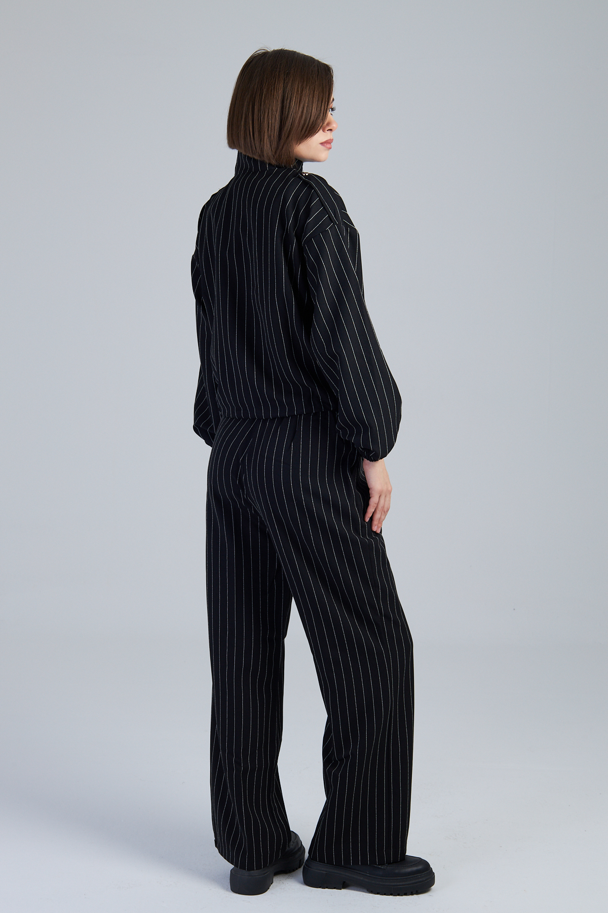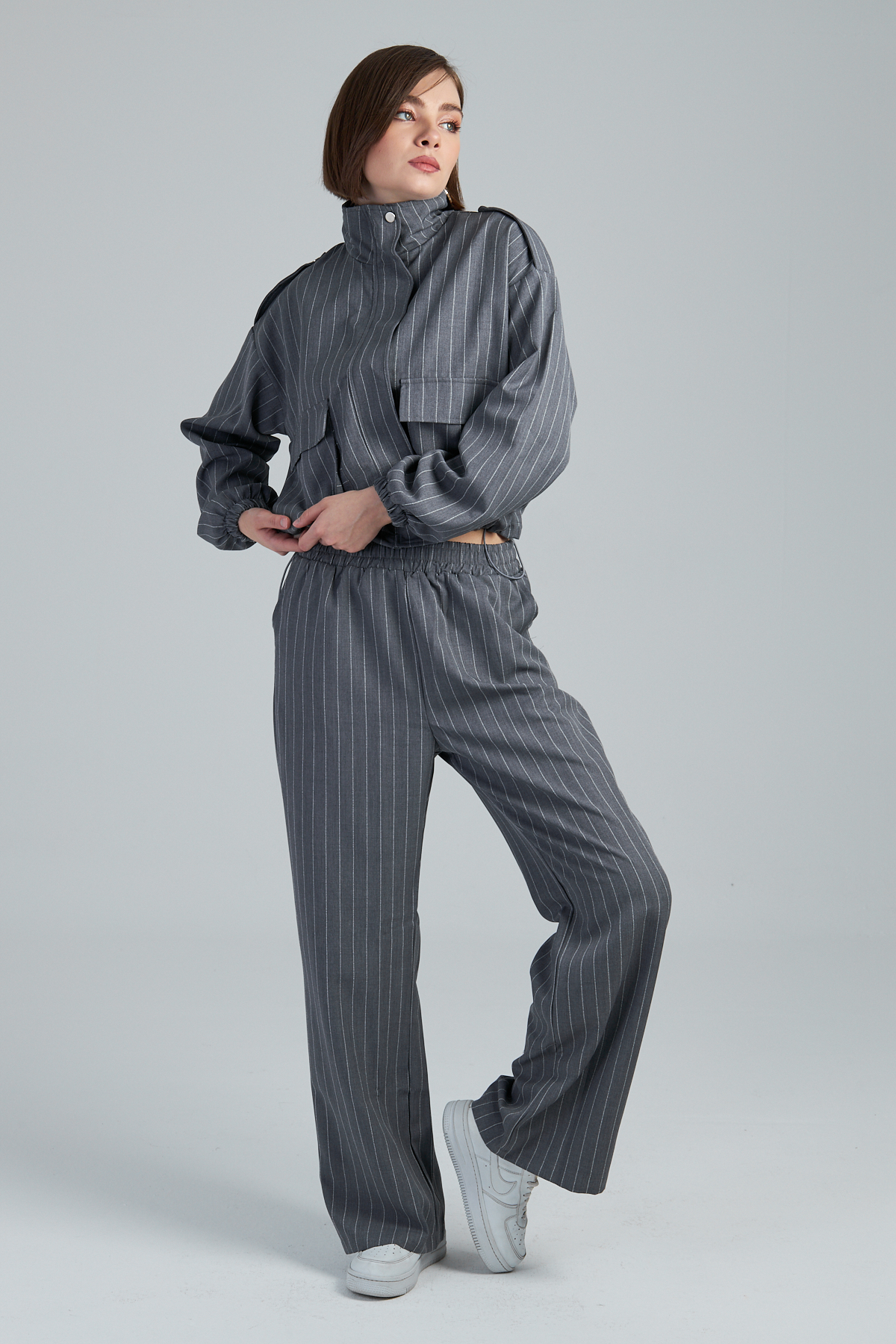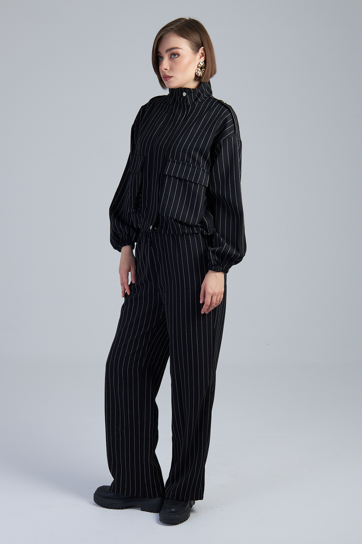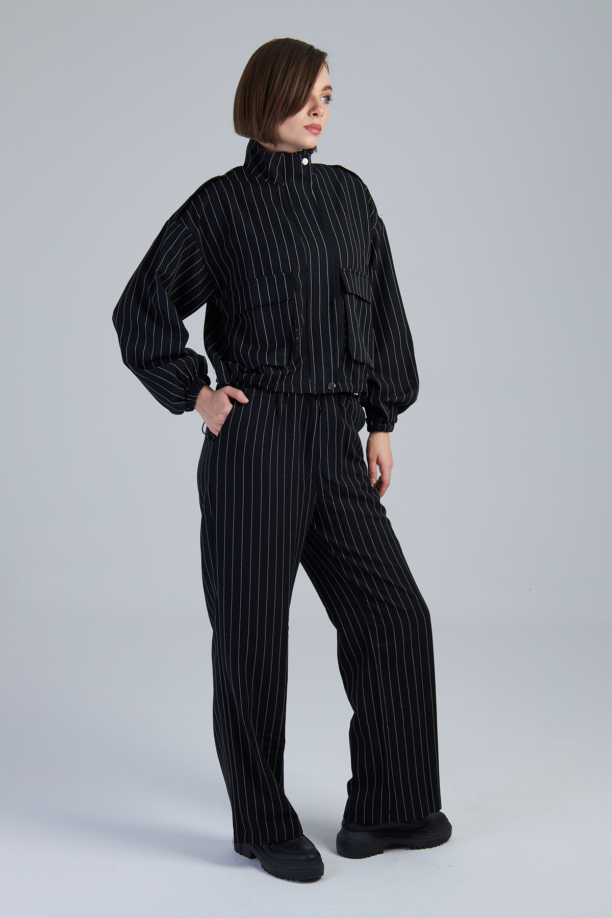 Çizgili Valencia Kumaş Kargo Cepli İkili Takım – %98 polyester %2 viskon çizgili valencia kumaştan üretilmiştir. Takma kol ve dik yaka detayıyla modern bir görünüm sunar. 4 cep ve kargo cep detayıyla işlevselliği artırır. Kumaşından çizgi baskılı olup, cekette stoper lastik detayı bulunmaktadır. Bezayağı dokuma tekniği ile üretilmiştir. Geniş kalıptır.