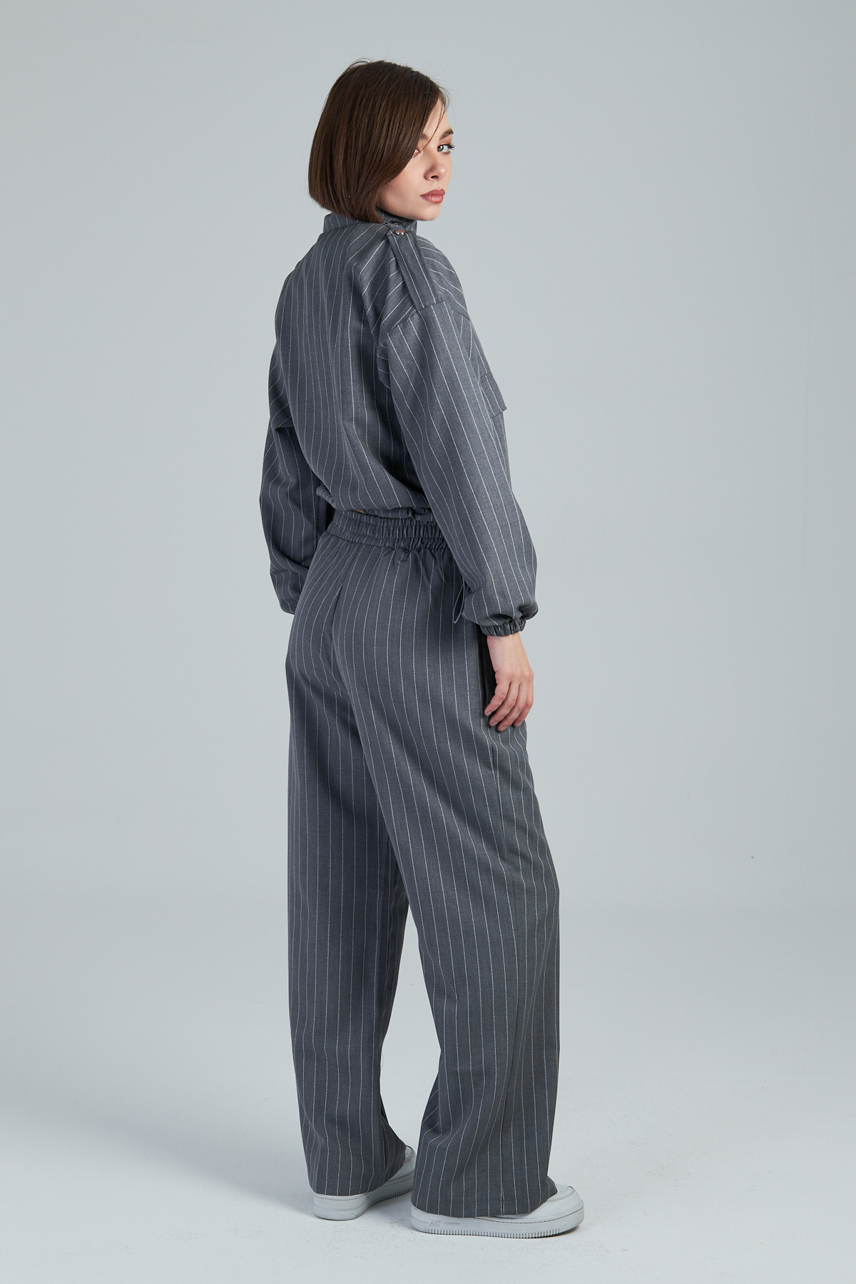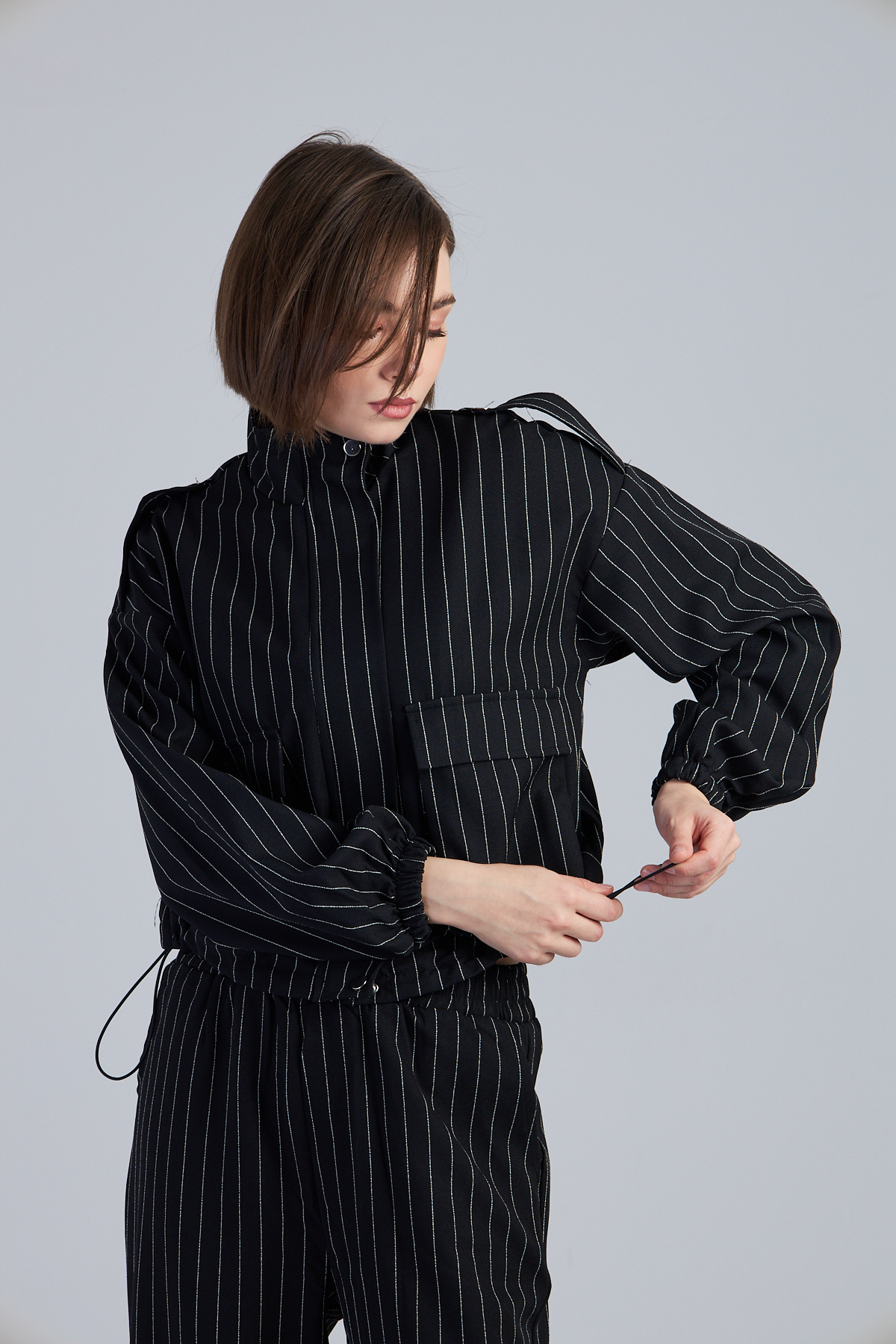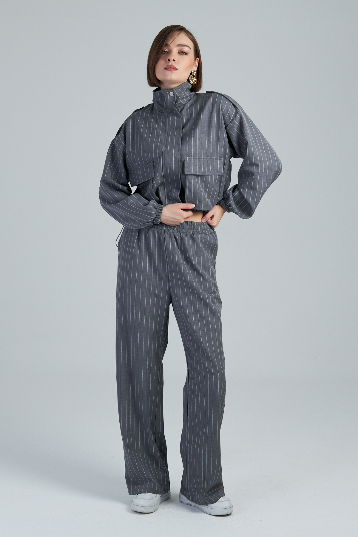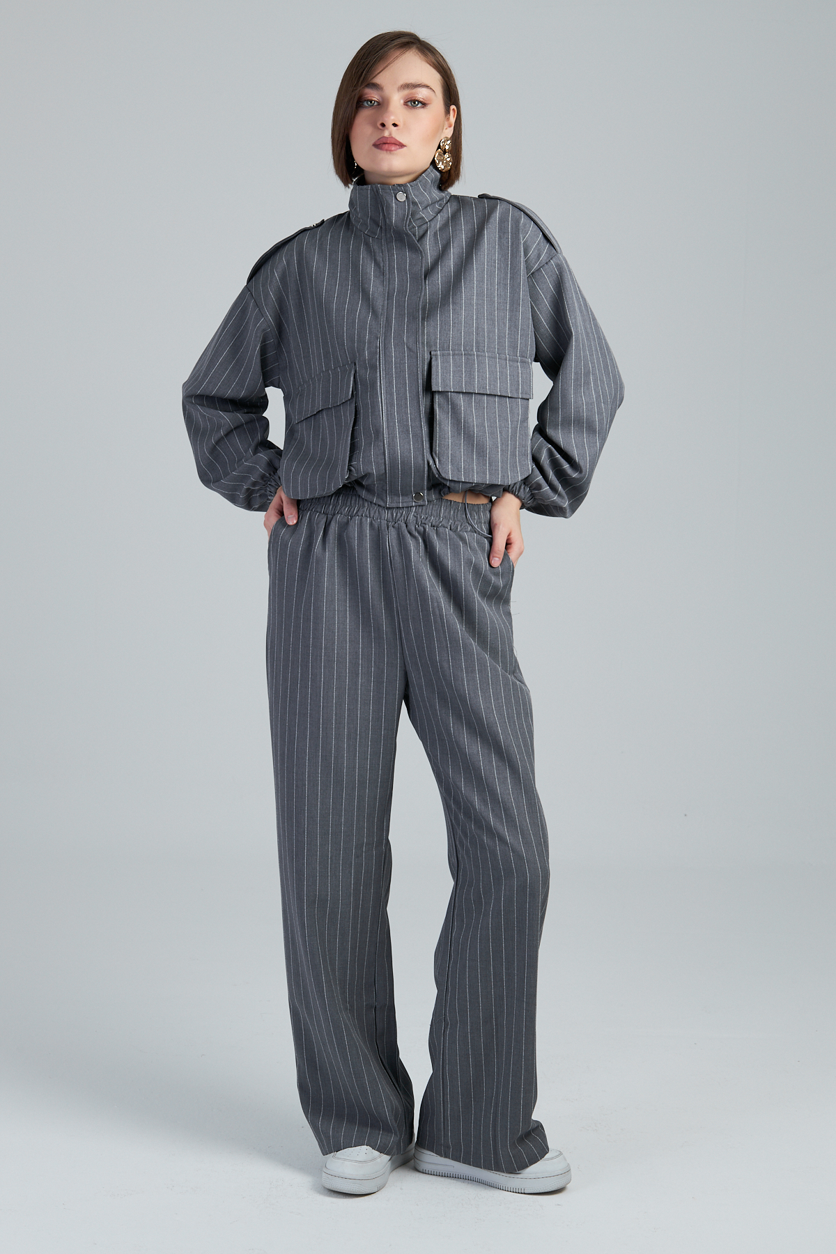 Çizgili Valencia Kumaş Kargo Cepli İkili Takım – %98 polyester %2 viskon çizgili valencia kumaştan üretilmiştir. Takma kol ve dik yaka detayıyla modern bir görünüm sunar. 4 cep ve kargo cep detayıyla işlevselliği artırır. Kumaşından çizgi baskılı olup, cekette stoper lastik detayı bulunmaktadır. Bezayağı dokuma tekniği ile üretilmiştir. Geniş kalıptır.