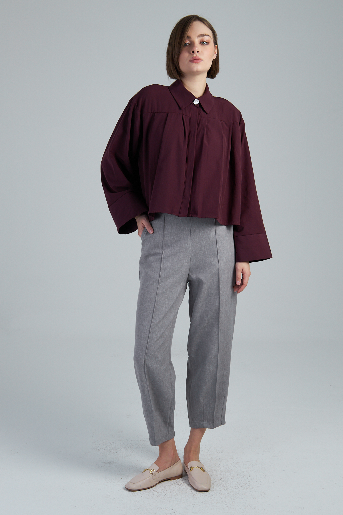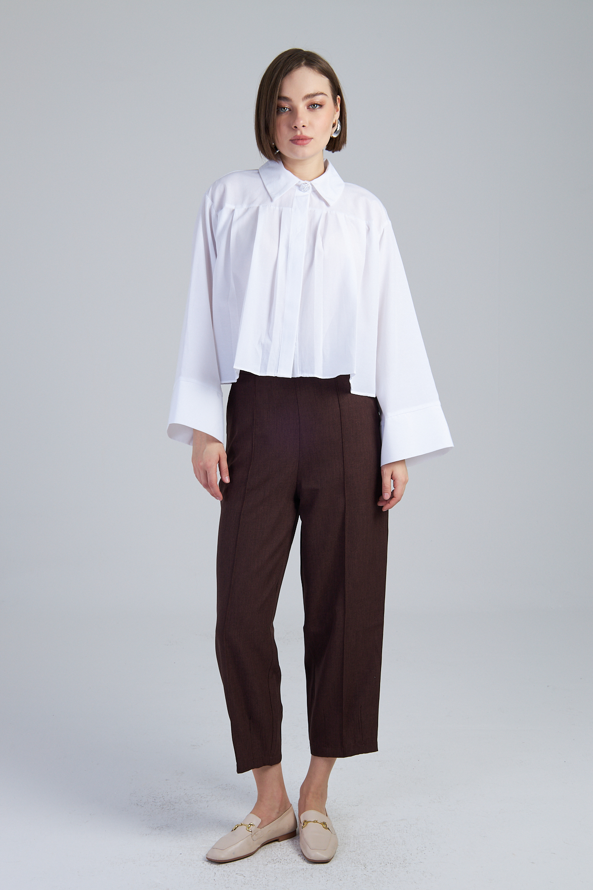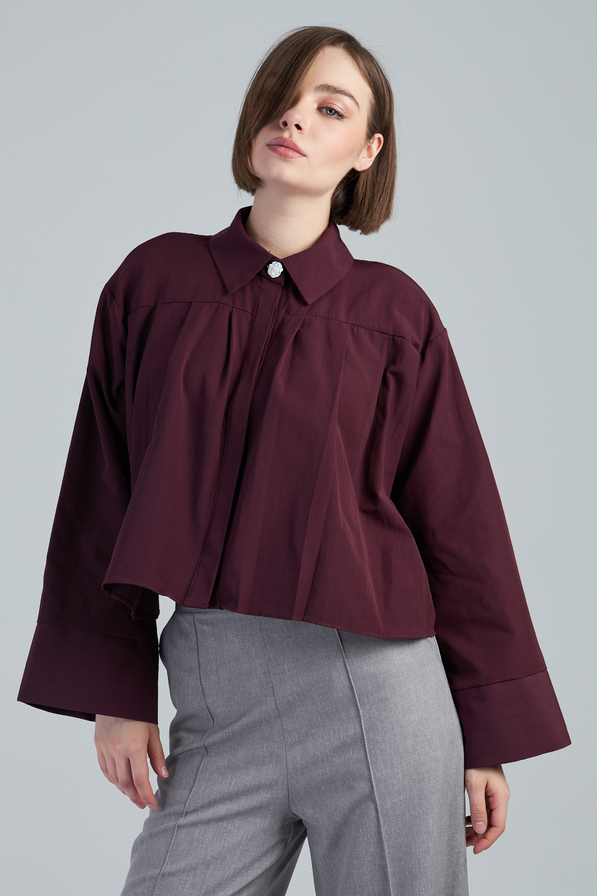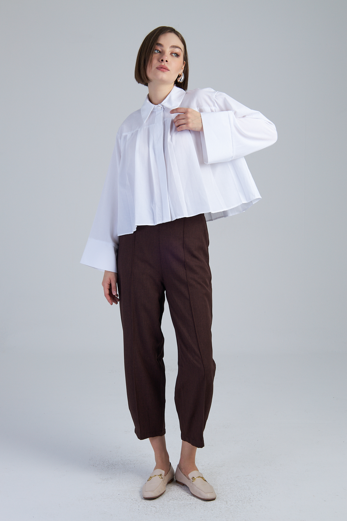 Terikoton Kumaş Pile Detaylı Kısa Gömlek – %60 pamuk %40 polyester terikoton kumaştan üretilmiştir. Oversize kol ve gömlek yaka detayıyla modern bir görünüm sunar. Pile detaylı tasarımıyla şıklığı tamamlar. Dokuma tekniği ile üretilmiştir. Oversize kalıptır.