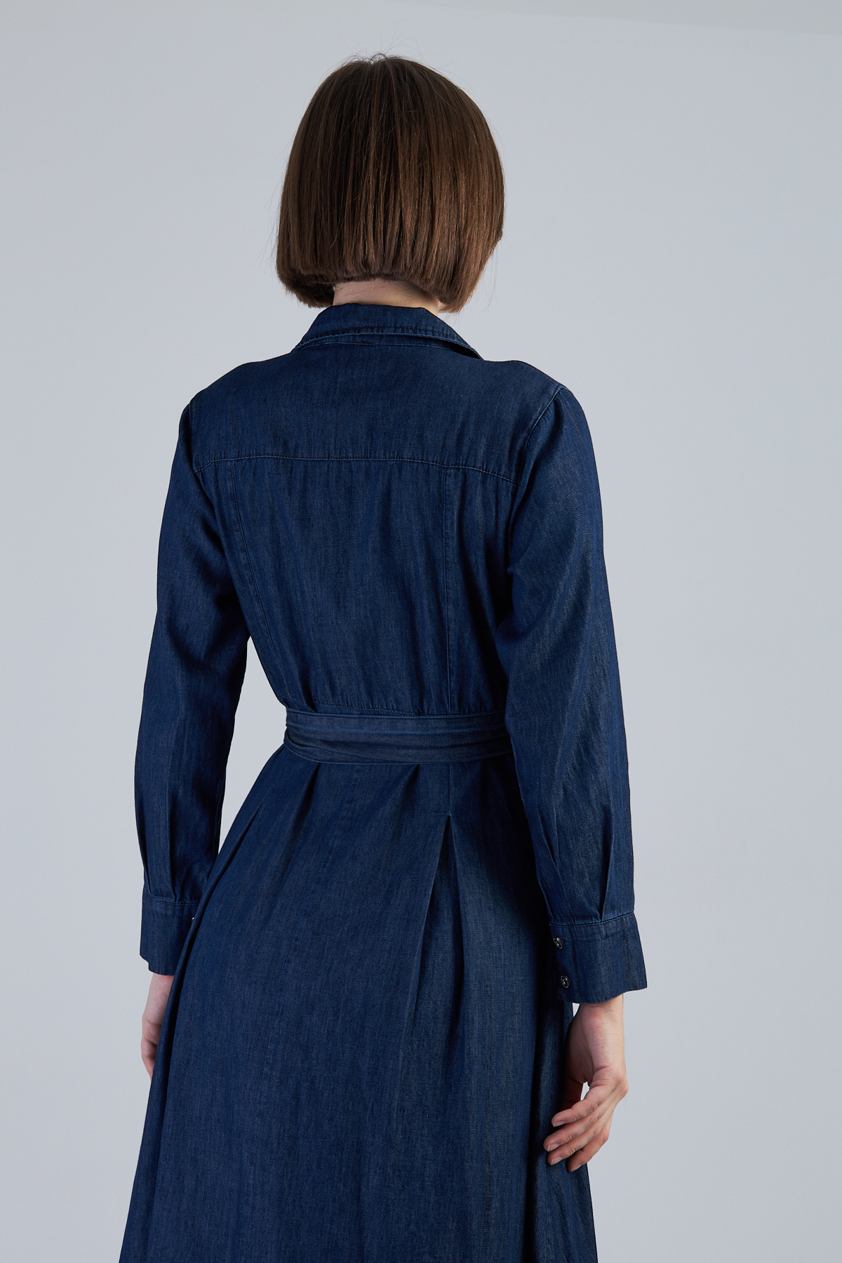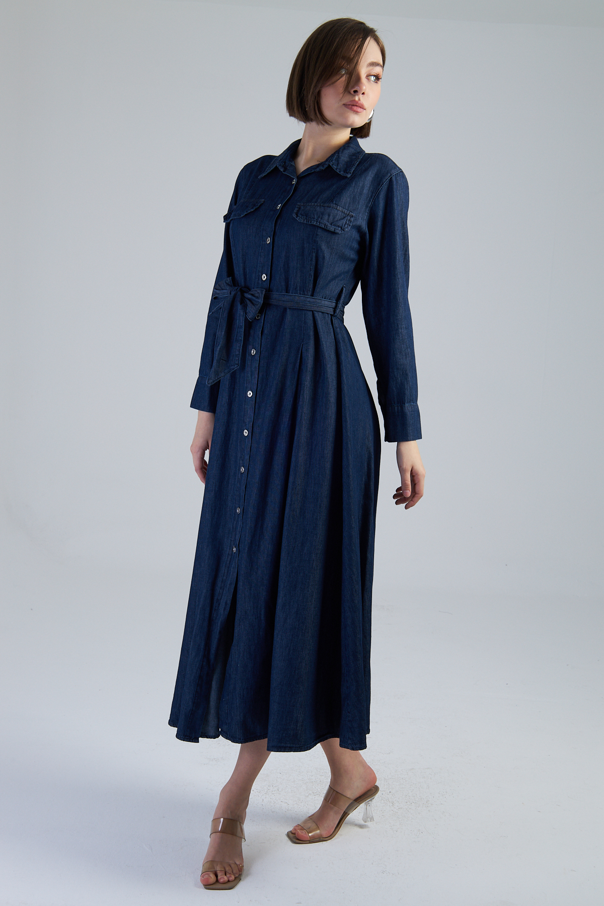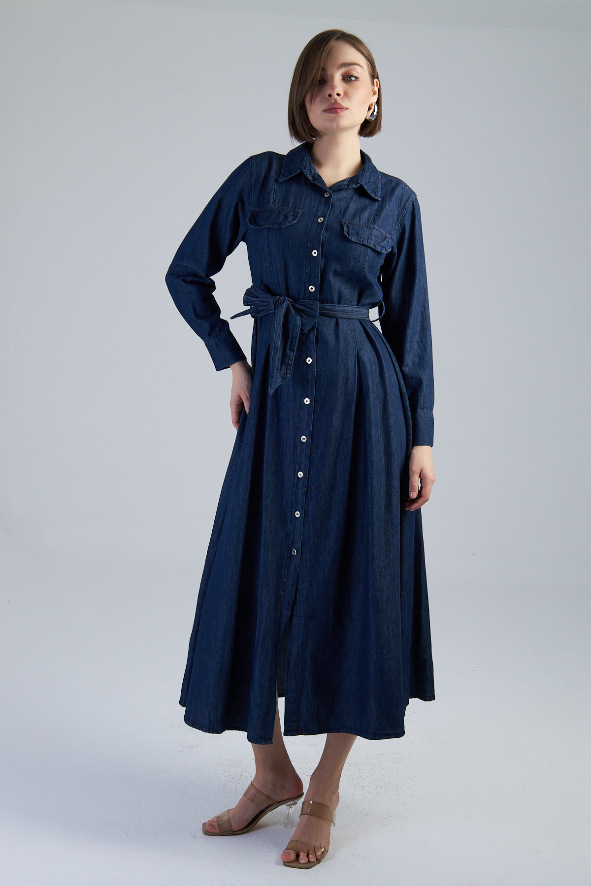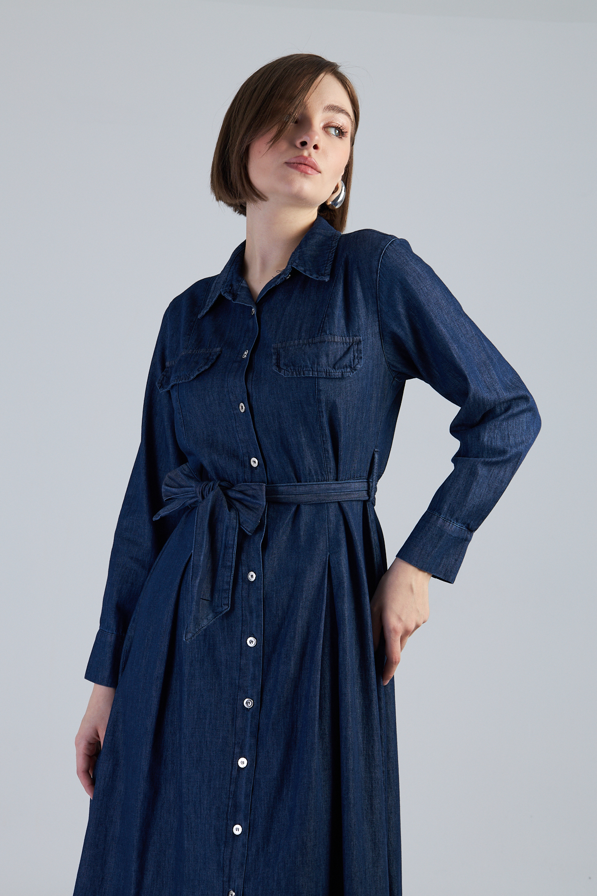 5,5 Onz Kot Kumaş Sahte Kapaklı Pens Detaylı Elbise – %100 pamuk 5,5 onz kot kumaştan üretilmiştir. Oversize kol manşet lastikli ve gömlek yaka detayıyla modern bir görünüm sunar. Sahte kapaklı pens detaylı tasarım ve kumaşından kuşak detayıyla şıklığı tamamlar. Denim dokuma tekniği ile üretilmiştir. Normal kalıptır.